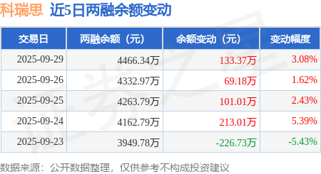 证券之星消息,9月29日,科瑞思(301314)融资买入424.78万元,融资偿还291.41万元,融资净买入133.37万元,融资余额4466.34万元,近3个交易日已连续净买入累计303.56万元,近20个交易日中有12个交易日出现融资净买入。