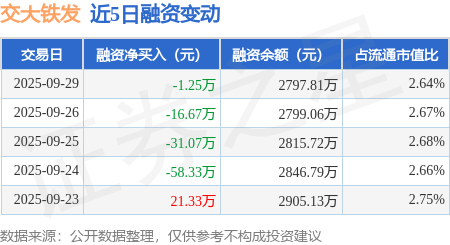 证券之星消息,9月29日,交大铁发(920027)融资买入39.04万元,融资偿还40.3万元,融资净卖出1.25万元,融资余额2797.81万元。