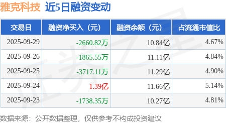 证券之星消息,9月29日,雅克科技(002409)融资买入1.63亿元,融资偿还1.9亿元,融资净卖出2660.82万元,融资余额10.84亿元。