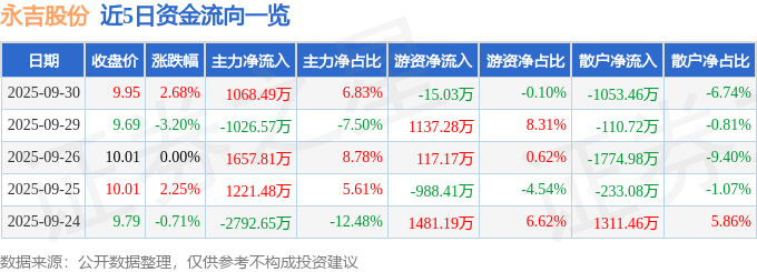 证券之星消息,截至2025年9月30日收盘,永吉股份(603058)报收于9.95元,上涨2.68%,换手率3.78%,成交量15.82万手,成交额1.56亿元。