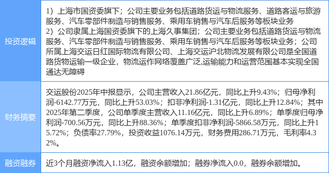 证券之星消息,交运股份9月30日涨停收盘,收盘价6.35元。该股于10点0分涨停,未打开涨停,截止收盘封单资金为3238.69万元,占其流通市值0.5%。