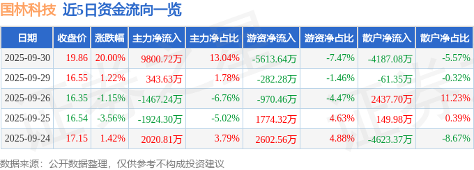 证券之星消息,截至2025年9月30日收盘,国林科技(300786)报收于19.86元,上涨20.0%,涨停,换手率27.51%,成交量40.34万手,成交额7.52亿元。