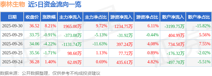 证券之星消息,截至2025年9月30日收盘,泰林生物(300813)报收于36.52元,上涨8.21%,换手率7.39%,成交量5.62万手,成交额2.02亿元。