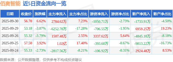 证券之星消息,截至2025年9月30日收盘,佰奥智能(300836)报收于56.7元,上涨6.62%,换手率10.94%,成交量6.92万手,成交额3.85亿元。