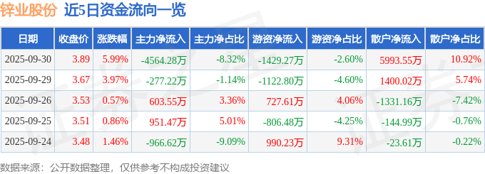 证券之星消息,截至2025年9月30日收盘,锌业股份(000751)报收于3.89元,上涨5.99%,换手率10.07%,成交量141.92万手,成交额5.49亿元。