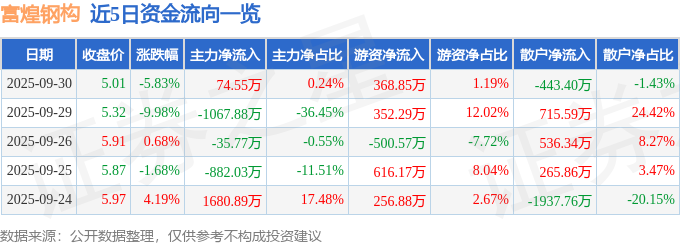 证券之星消息,截至2025年9月30日收盘,富煌钢构(002743)报收于5.01元,下跌5.83%,换手率14.19%,成交量61.68万手,成交额3.1亿元。