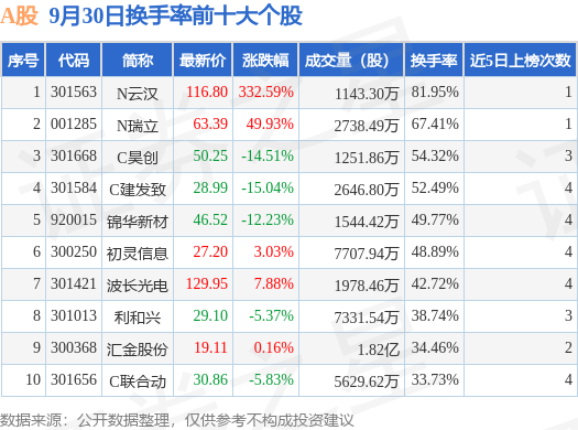 当日A股换手率前10大个股中5只个股收涨,平均涨幅78.72%,其中N云汉(301563)以换手率81.95%排第一,8只个股近5个交易日中多次上榜。
