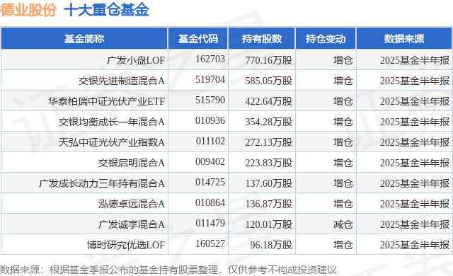根据2025基金半年报公募基金重仓股数据,重仓该股的公募基金共82家,其中持有数量最多的公募基金为广发基金的广发小盘LOF。广发小盘LOF目前规模为50.27亿元,最新净值1.6779(9月29日),较上一交易日上涨0.78%,近一年上涨38.49%。该公募基金现任基金经理为刘格菘 吴远怡 陈韫中。刘格菘在任的基金产品包括:广发创新升级混合,管理时间为2017年7月5日至今,期间收益率为129.8%;广发双擎升级混合A,管理时间为2018年11月2日至今,期间收益率为149.79%;广发科技先锋混合,管理时间为2020年1月22日至今,期间收益率为8.17%。吴远怡在任的基金产品包括:广发创新升级混合,管理时间为2020年9月30日至今,期间收益率为-14.49%;广发科技创新混合A,管理时间为2020年11月18日至今,期间收益率为81.18%;广发北交所精选两年定开混合A,管理时间为2021年11月23日至今,期间收益率为76.86%;广发价值核心混合A,管理时间为2022年11月1日至今,期间收益率为89.31%。陈韫中在任的基金产品包括:广发中小盘精选混合A,管理时间为2021年9月28日至今,期间收益率为42.14%;广发成长启航混合A,管理时间为2024年3月19日至今,期间收益率为137.71%;广发科技动力股票,管理时间为2024年5月31日至今,期间收益率为58.43%;