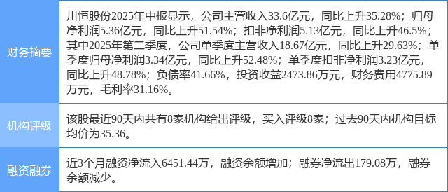 2025年9月3日,华安证券研究员王强峰,刘天其发布了对川恒股份的研报《上半年业绩快速增长,持续深化产业链布局》,该研报对川恒股份给出“买入”评级。研报中预计公司2025-2027年归母净利润分别为12.29、14.44、18.53亿元,对应PE分别为13、11、9倍。维持“买入”评级。证券之星数据中心根据近三年发布的研报数据计算,该研报作者对此股的盈利预测准确度为98.59%。