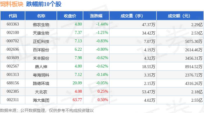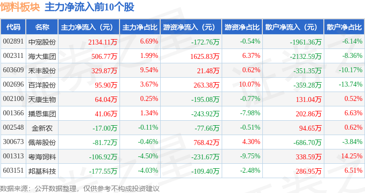 从资金流向上来看,当日饲料板块主力资金净流出5500.35万元,游资资金净流入947.21万元,散户资金净流入4553.14万元。饲料板块个股资金流向见下表: