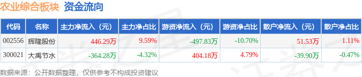 从资金流向上来看,当日农业综合板块主力资金净流入82.02万元,游资资金净流出93.65万元,散户资金净流入11.63万元。农业综合板块个股资金流向见下表:
