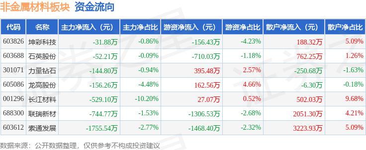 从资金流向上来看,当日非金属材料板块主力资金净流出3414.57万元,游资资金净流出3056.27万元,散户资金净流入6470.84万元。非金属材料板块个股资金流向见下表: