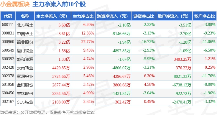 从资金流向上来看,当日小金属板块主力资金净流入14.78亿元,游资资金净流出6.03亿元,散户资金净流出8.75亿元。小金属板块个股资金流向见下表: