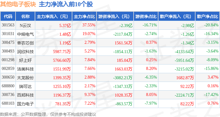 从资金流向上来看,当日其他电子板块主力资金净流入2.49亿元,游资资金净流出3.43亿元,散户资金净流入9444.67万元。其他电子板块个股资金流向见下表: