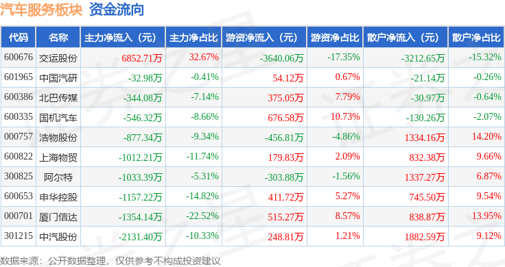 从资金流向上来看,当日汽车服务板块主力资金净流出1636.37万元,游资资金净流出1939.38万元,散户资金净流入3575.75万元。汽车服务板块个股资金流向见下表: