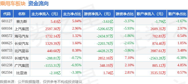 从资金流向上来看,当日乘用车板块主力资金净流入3.78亿元,游资资金净流出2.98亿元,散户资金净流出7969.3万元。乘用车板块个股资金流向见下表: