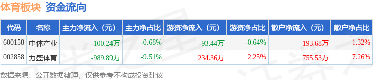 从资金流向上来看,当日体育板块主力资金净流出1090.13万元,游资资金净流入140.92万元,散户资金净流入949.21万元。体育板块个股资金流向见下表: