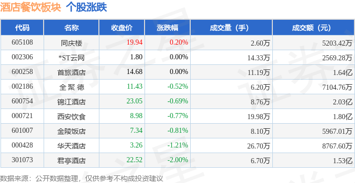 证券之星消息,9月30日酒店餐饮板块较上一交易日下跌0.54%,君亭酒店领跌。当日上证指数报收于3882.78,上涨0.52%。深证成指报收于13526.51,上涨0.35%。酒店餐饮板块个股涨跌见下表: