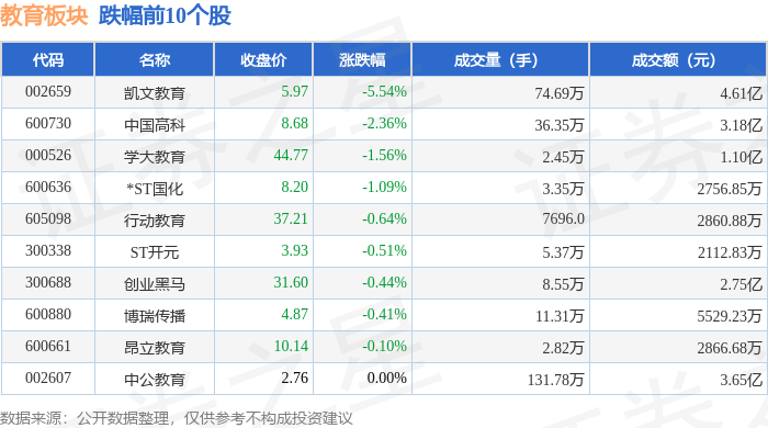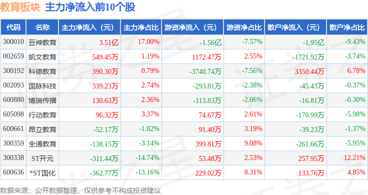 从资金流向上来看,当日教育板块主力资金净流入2.52亿元,游资资金净流出1.52亿元,散户资金净流出1.0亿元。教育板块个股资金流向见下表: