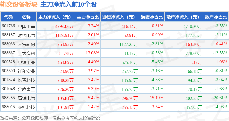 从资金流向上来看,当日轨交设备板块主力资金净流出5184.66万元,游资资金净流入2118.41万元,散户资金净流入3066.24万元。轨交设备板块个股资金流向见下表:
