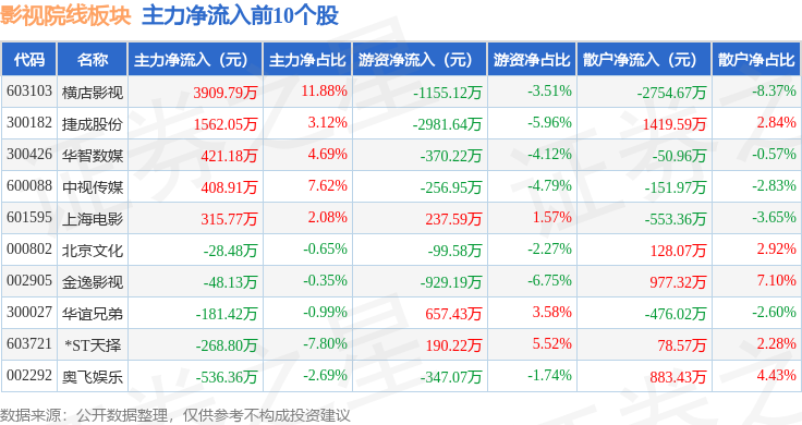 从资金流向上来看,当日影视院线板块主力资金净流出2.36亿元,游资资金净流出5208.15万元,散户资金净流入2.88亿元。影视院线板块个股资金流向见下表: