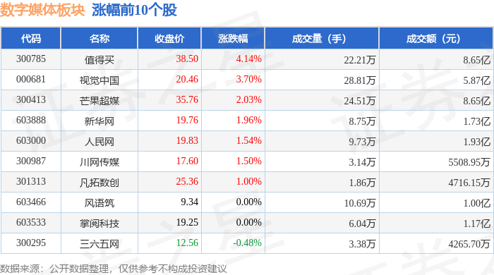 证券之星消息,9月30日数字媒体板块较上一交易日上涨1.37%,值得买领涨。当日上证指数报收于3882.78,上涨0.52%。深证成指报收于13526.51,上涨0.35%。数字媒体板块个股涨跌见下表: