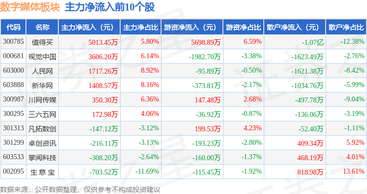 从资金流向上来看,当日数字媒体板块主力资金净流出2381.49万元,游资资金净流入1.15亿元,散户资金净流出9111.57万元。数字媒体板块个股资金流向见下表: