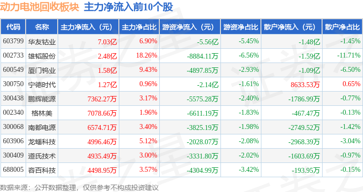 从资金流向上来看,当日动力电池回收板块主力资金净流出2.43亿元,游资资金净流出6.3亿元,散户资金净流入8.73亿元。动力电池回收板块个股资金流向见下表: