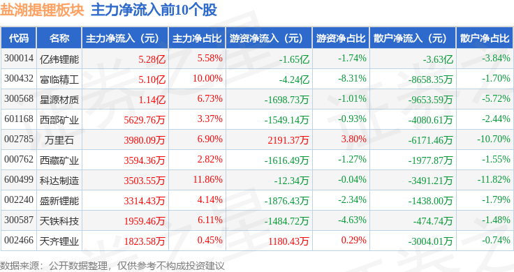 从资金流向上来看,当日盐湖提锂板块主力资金净流出3.93亿元,游资资金净流入1.29亿元,散户资金净流入2.63亿元。盐湖提锂板块个股资金流向见下表: