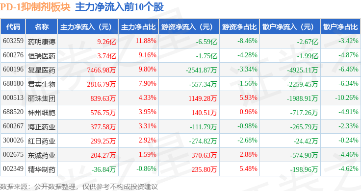 从资金流向上来看,当日PD-1抑制剂板块主力资金净流入12.7亿元,游资资金净流出7.32亿元,散户资金净流出5.39亿元。PD-1抑制剂板块个股资金流向见下表: