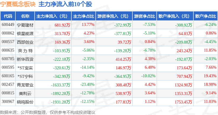 从资金流向上来看,当日宁夏概念板块主力资金净流出2.92亿元,游资资金净流入7330.56万元,散户资金净流入2.18亿元。宁夏概念板块个股资金流向见下表:
