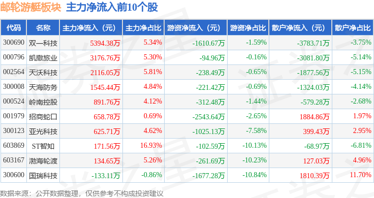 从资金流向上来看,当日邮轮游艇板块主力资金净流出6.76亿元,游资资金净流入4526.4万元,散户资金净流入6.31亿元。邮轮游艇板块个股资金流向见下表: