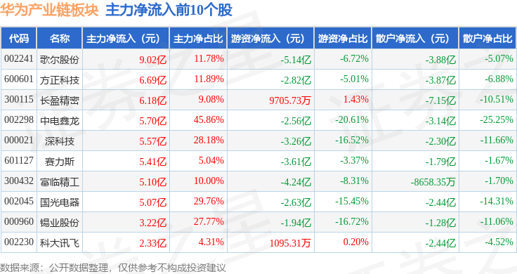 从资金流向上来看,当日华为产业链板块主力资金净流出74.5亿元,游资资金净流入8.55亿元,散户资金净流入65.95亿元。华为产业链板块个股资金流向见下表: