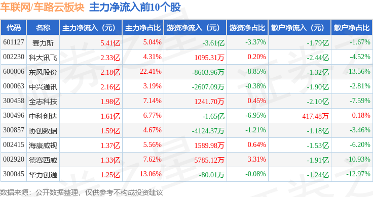 从资金流向上来看,当日车联网/车路云板块主力资金净流入2.24亿元,游资资金净流出3.05亿元,散户资金净流入8079.9万元。车联网/车路云板块个股资金流向见下表: