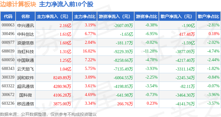 从资金流向上来看,当日边缘计算板块主力资金净流出6.53亿元,游资资金净流出2.26亿元,散户资金净流入8.79亿元。边缘计算板块个股资金流向见下表: