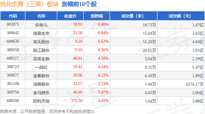 从资金流向上来看,当日优化生育(三孩)板块主力资金净流出1.9亿元,游资资金净流入1.12亿元,散户资金净流入7783.95万元。优化生育(三孩)板块个股资金流向见下表: