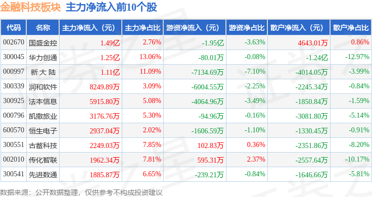 从资金流向上来看,当日金融科技板块主力资金净流出48.15亿元,游资资金净流入10.53亿元,散户资金净流入37.62亿元。金融科技板块个股资金流向见下表: