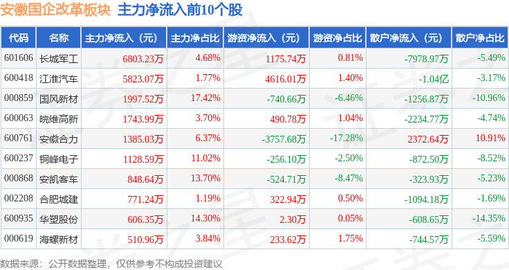 从资金流向上来看,当日安徽国企改革板块主力资金净流出4.88亿元,游资资金净流入6526.1万元,散户资金净流入4.23亿元。安徽国企改革板块个股资金流向见下表: