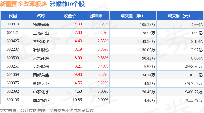 证券之星消息,9月30日新疆国企改革板块较上一交易日上涨0.05%,德展健康领涨。当日上证指数报收于3882.78,上涨0.52%。深证成指报收于13526.51,上涨0.35%。新疆国企改革板块个股涨跌见下表:
