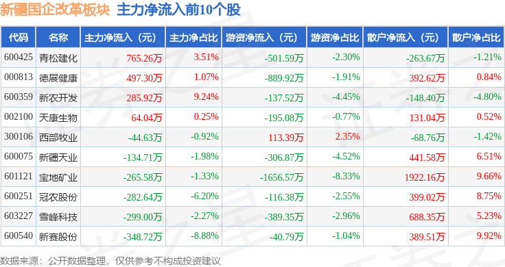 从资金流向上来看,当日新疆国企改革板块主力资金净流出2.72亿元,游资资金净流入654.87万元,散户资金净流入2.65亿元。新疆国企改革板块个股资金流向见下表:
