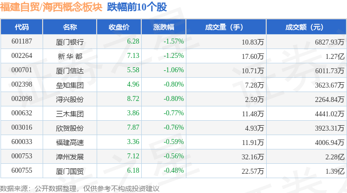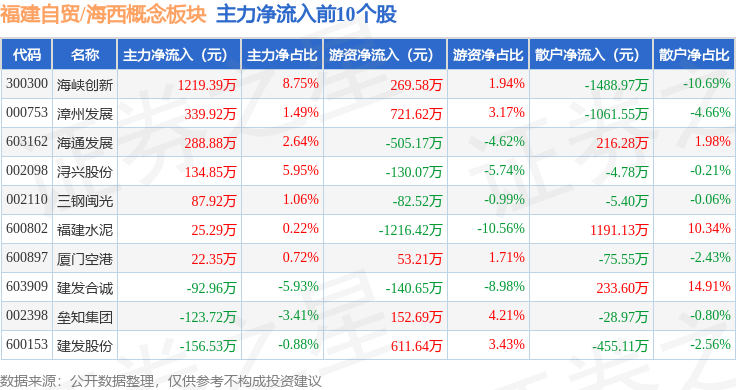 从资金流向上来看,当日福建自贸/海西概念板块主力资金净流出1.04亿元,游资资金净流入3568.12万元,散户资金净流入6795.98万元。福建自贸/海西概念板块个股资金流向见下表: