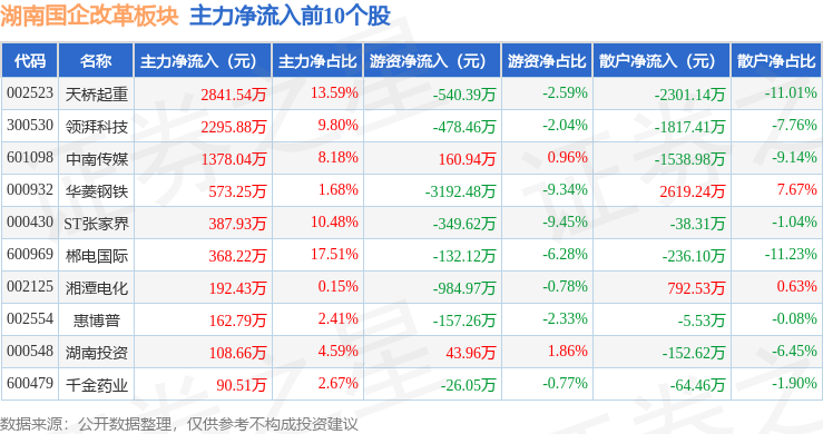 从资金流向上来看,当日湖南国企改革板块主力资金净流出3.64亿元,游资资金净流入1620.8万元,散户资金净流入3.48亿元。湖南国企改革板块个股资金流向见下表:
