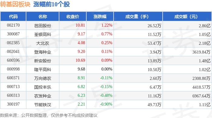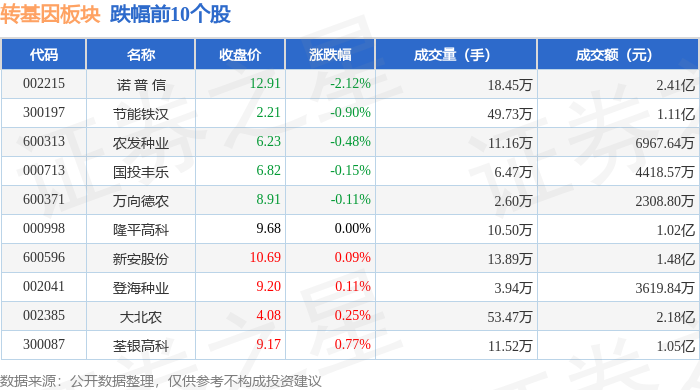 证券之星消息,9月30日转基因板块较上一交易日下跌0.1%,诺 普 信领跌。当日上证指数报收于3882.78,上涨0.52%。深证成指报收于13526.51,上涨0.35%。转基因板块个股涨跌见下表: