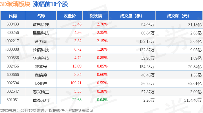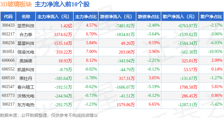 从资金流向上来看,当日3D玻璃板块主力资金净流出3.71亿元,游资资金净流入1.45亿元,散户资金净流入2.26亿元。3D玻璃板块个股资金流向见下表: