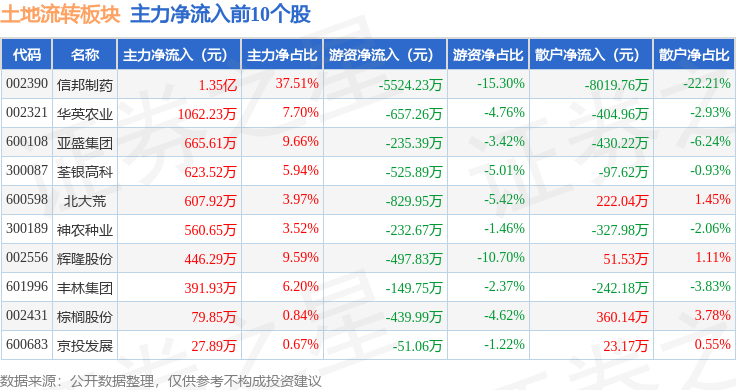 从资金流向上来看,当日土地流转板块主力资金净流出1.33亿元,游资资金净流出7678.31万元,散户资金净流入2.09亿元。土地流转板块个股资金流向见下表: