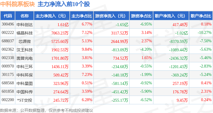 从资金流向上来看,当日中科院系板块主力资金净流出3.61亿元,游资资金净流入1.34亿元,散户资金净流入2.27亿元。中科院系板块个股资金流向见下表: