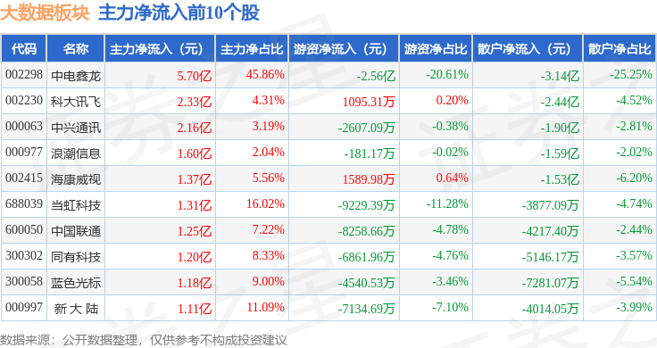 从资金流向上来看,当日大数据板块主力资金净流出45.18亿元,游资资金净流入17.72亿元,散户资金净流入27.46亿元。大数据板块个股资金流向见下表: