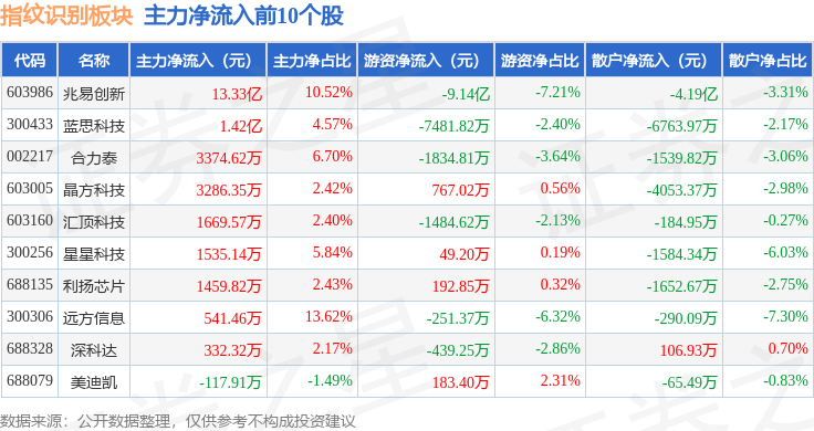从资金流向上来看,当日指纹识别板块主力资金净流入10.71亿元,游资资金净流出8.56亿元,散户资金净流出2.14亿元。指纹识别板块个股资金流向见下表: