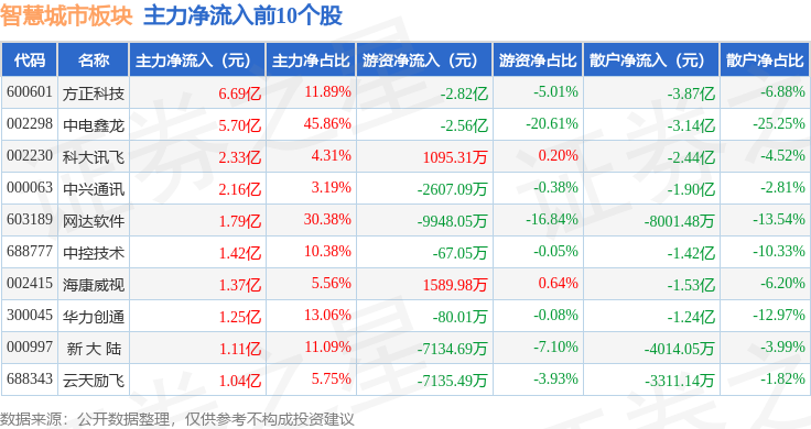 从资金流向上来看,当日智慧城市板块主力资金净流出23.42亿元,游资资金净流入12.58亿元,散户资金净流入10.85亿元。智慧城市板块个股资金流向见下表: