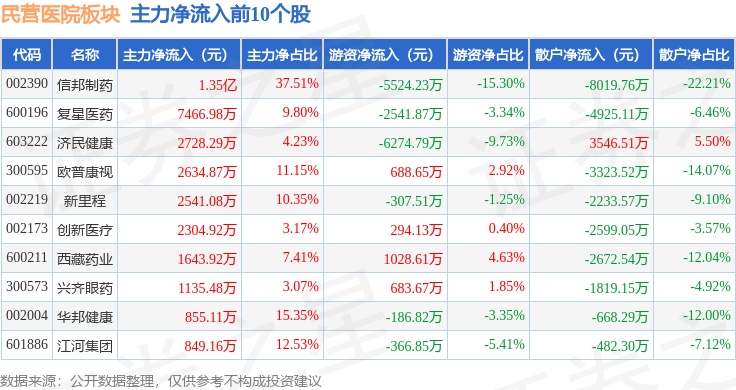 从资金流向上来看,当日民营医院板块主力资金净流入8867.34万元,游资资金净流出9536.84万元,散户资金净流入669.49万元。民营医院板块个股资金流向见下表: